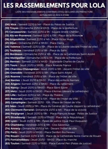 Marine Le Pen et Jordan Bardella ont annoncé ce mercredi 19 octobre que le RN ne sera pas présent aux manifestations de samedi prochain organisées dans toute la France par l'Institut pour la Justice pour honorer la mémoire de la petite Lola sauvagement assassinée par une Algérienne il y a quelques jours ; cette défection intervient au motif, selon les dires de Bardella, qu'il y aurait une « captation partisane de la mobilisation qui ne correspond pas à l'état d'esprit initial d'une marche citoyenne apolitique » (Le Figaro numérique).