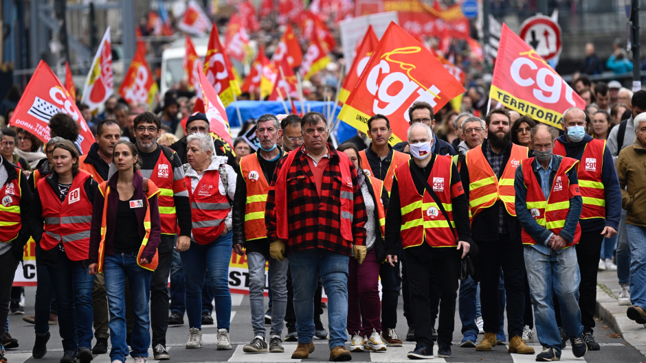 Photo d'ouverture : Des manifestants défilent lors d'une manifestation à Rennes, le 18 octobre 2022, après que les syndicats CGT et FO ont appelé à une grève nationale pour réclamer une hausse des salaires, et contre la réquisition par le gouvernement des raffineries de carburant - Damien Meyer - @Shutterstock