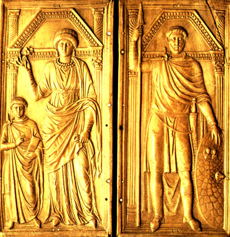Alors, à quoi auraient pu ressembler Athaulf et Placidia ? À propos d'Athaulf, le fait qu'il ait été roi barbare ne signifie pas qu'il faille l'imaginer en Arnold Schwarzenegger dans le film « Conan le barbare ». Pas du tout, bien sûr ! Athaulf ne se promenait sûrement pas habillé d'une peau d'ours et avec un casque à cornes sur la tête. Le mieux que nous puissions faire pour le visualiser est de penser au portrait contemporain d'un barbare de haut rang que nous avons : Flavius Stilicho ; le général vandale qui était le père adoptif de Placidia. Nous avons un diptyque en ivoire de lui et de sa femme, Serena, et de leur fils, Eucherius. Dans cette image, Stilicho est montré comme grand et beau ; un peu solennel en portant des vêtements romains. Athaulf aurait pu lui ressembler : grand, beau et barbu.