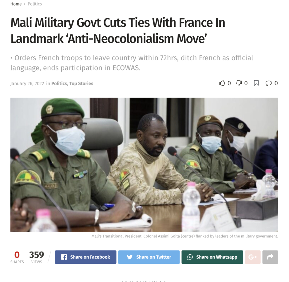Il est à noter qu'en janvier 2022, la République du Mali dirigée par le colonel Assimi Goita – qui est à la fois un « ami de l'Amérique » et un instrument du Pentagone – avait déjà en 2022 préparer le terrain pour « Chasser la France de l'Afrique ».