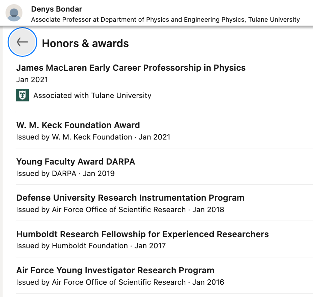 Honors and awards indicated on Denys Bondar's LinkedIn profile, September 23, 2023. (screenshot)