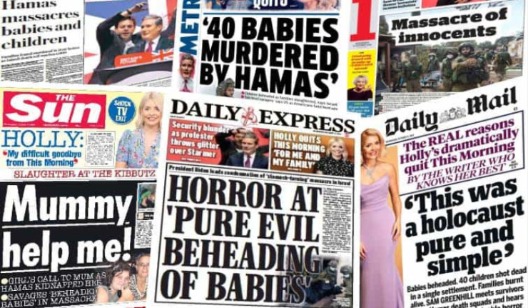 Pratiquement tous les journaux britanniques ont rapporté cette semaine que les combattants du Hamas auraient décapité 40 bébés lors de l'assaut du week-end dernier. La plupart d'entre eux l'ont mis en première page.