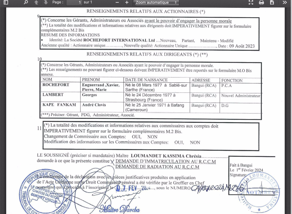 Heureusement, Foucher peut compter sur un associé beaucoup plus présentable, qui peut montrer patte blanche à sa place : Enguerrand Rochefort. Dans les années 2000, ce banquier a fait ses armes aux côtés de Jean-Marie Messier, un ancien "Mozart de la finance" qui a favorisé l'ascension d'un certain Emmanuel Macron. Enguerrand Rochefort, qui n'a pas donné suite aux sollicitations de Off, a ensuite fondé sa propre "banque d'affaires" Rochefort & Associés, en réalité une ancienne entreprise de fabrication de matériel de sport qui ne compte à l'heure actuelle aucun salarié fixe. D'après les documents déposés au greffe centrafricain et consultés par Off Investigation, la maison-mère de Tamoil est officiellement une micro-entreprise londonienne appelée Rochefort International Limited et qui n'affiche que 1000 livres sterling de capital. Fin mars 2023, soit un mois après l'accord passé pour racheter TotalEnergies en Centrafrique, Rochefort International Limited n'avait que 35 000 livres sterling (soit un peu plus de 41 000 euros) en trésorerie. Difficile de ne pas se demander d'où vient vraiment l'argent qui a servi à sceller ce deal, tant les capacités financières d'Enguerrand Rochefort et de sa banque d'affaires paraissent limitées. Selon les informations d'Off Investigation, Total aurait même accordé des facilités de paiement en plusieurs fois à son repreneur en République Centrafricaine.