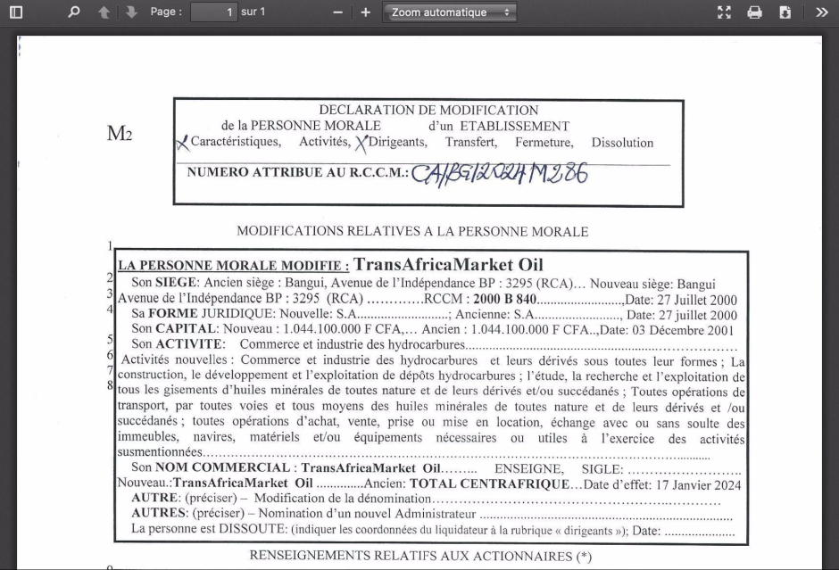 (ndlr : Off Investigation a pu néanmoins vérifier que le capital de Total Centrafrique est environ d'1,5 million d'euros).