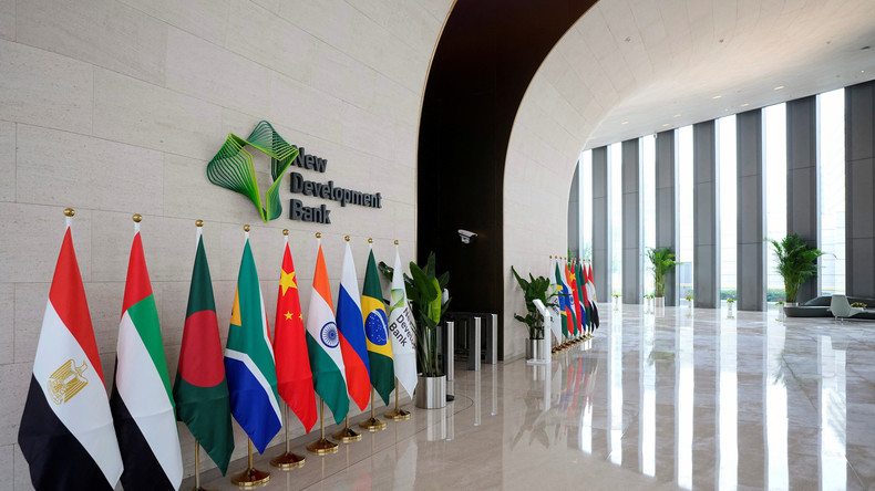 Une vue du logo de la Nouvelle Banque de Développement (NDB) à son siège à Shanghai, en Chine, le 10 juillet 2023.