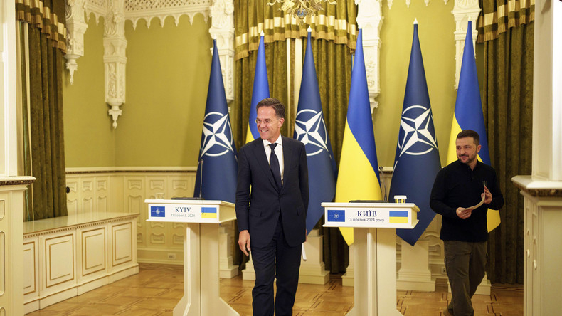 Mark Rutte, nouveau secrétaire général de l'OTAN, et Volodymyr Zelensky quittent la salle après une conférence de presse commune à Kiev.