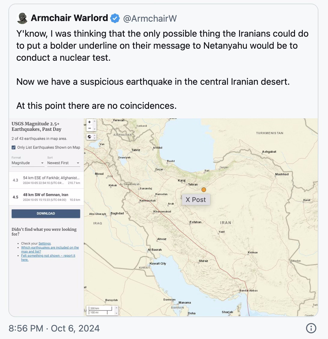 Le 5 octobre 2024, une secousse sismique de magnitude 4,5 s' est produite dans la province iranienne de Semnan, suscitant des spéculations selon lesquelles l'Iran aurait procédé à son premier essai d'arme nucléaire.