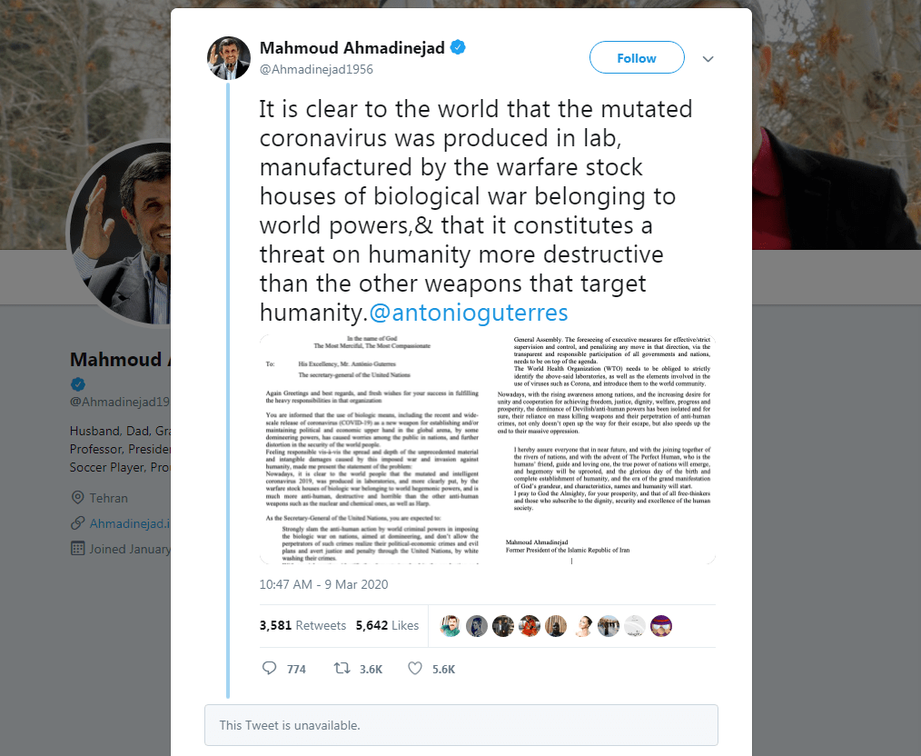 Peu après, le guide suprême iranien Ali Khamenei a adopté la même position publique, tandis que l'ancien président populiste Mahmoud Ahmadinejad s'est fait particulièrement entendre sur Twitter pendant plusieurs mois, adressant même ses accusations formelles au secrétaire général de l'ONU Antonio Guterres. Un seul de ses nombreux tweets a attiré plusieurs milliers de Retweets et de Likes.
