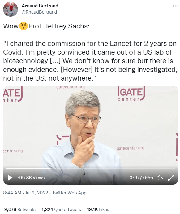 Il y a six mois, Sachs a été interviewé par Tucker Carlson, et vers la fin de sa longue discussion, il a abordé cette question extrêmement importante et les tentatives faites par l'ensemble de notre establishment gouvernemental et scientifique pour la dissimuler. Cette émission a suscité 9,5 millions d'impressions sur Twitter et près de deux millions de vues sur YouTube.