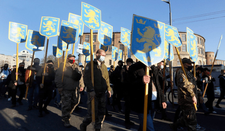 Aux États Baltes, comme en Lettonie et en Estonie, on élève des monuments voués aux anciens SS, en Ukraine, aux membres de la division Waffen-SS Galichina. C'est l'un de ces «vétérans», Yaroslav Hunka, criminel de guerre qui a combattu sous la croix gammée d'Hitler, que Zelensky applaudissait debout au Parlement canadien en septembre 2023. Les soldats de la division Waffen-SS Galichina, dont les rangs étaient formés notamment à partir de membres d'OUN, collaboraient directement avec les unités SS et la gendarmerie d'Hitler. Déployé en Slovaquie, un des régiments de cette division a participé aux répressions du Soulèvement national slovaque (1944), puis a été déplacé en Yougoslavie pour combattre la guérilla. Ces ovations au Parlement canadien glorifiant le nazisme ne s'arrêtent pas jusqu'à ce jour.