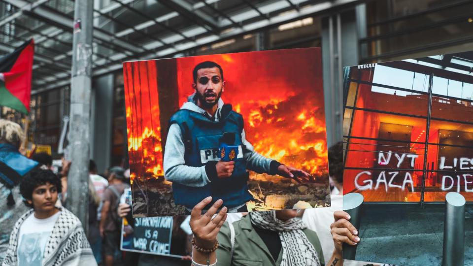 Des manifestants se rassemblent devant le siège du New York Times au lendemain du meurtre de six journalistes à Gaza par Israël, dont le correspondant très apprécié d'Al Jazeera, Anas al-Sharif (photo). Times Square, New York, États-Unis. 12 août 2025. (Adem Wijewickrema/The Public Source)