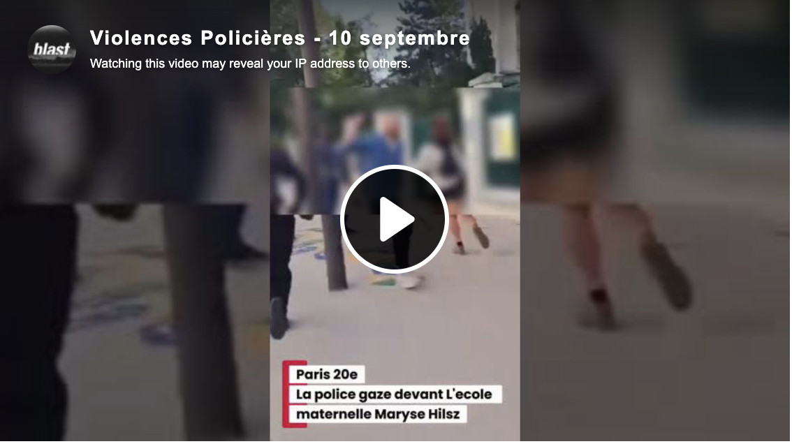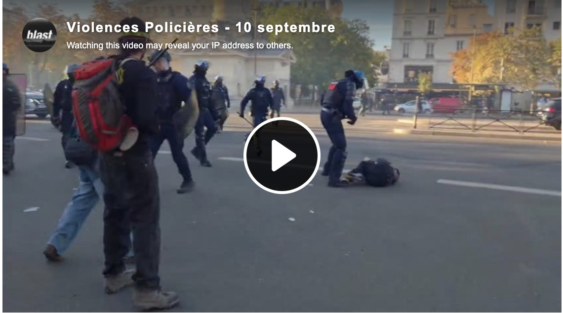 Manifestants frappés sans raison apparente, gazages à bout portant, y compris devant une école et un parc fréquenté par des enfants, étranglement d'un manifestant et d'un journaliste : la mobilisation du 10 septembre s'est accompagnée de la cohorte désormais habituelle de brutalités policières. La mobilisation a pourtant été, dans l'ensemble, assez calme.