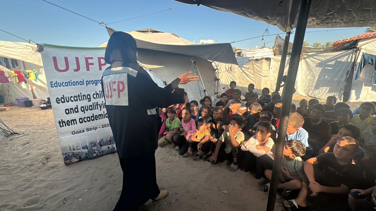 Dès les premiers jours de la guerre, l'UJFP a accordé à l'éducation une priorité absolue. Elle a donc rapidement mis en place et soutenu plusieurs centres éducatifs dans différentes zones de la bande de Gaza : depuis Mawassi Khan Younès, en passant par la région d'Abou Taïma et Deir al-Balah, jusqu'à l'ouest de Nuseirat. Ces centres ont accueilli des centaines d'élèves déplacés venus de divers endroits du territoire, offrant un environnement relativement sûr qui leur permet de poursuivre leur scolarité, tout en recevant un accompagnement psychologique et social.