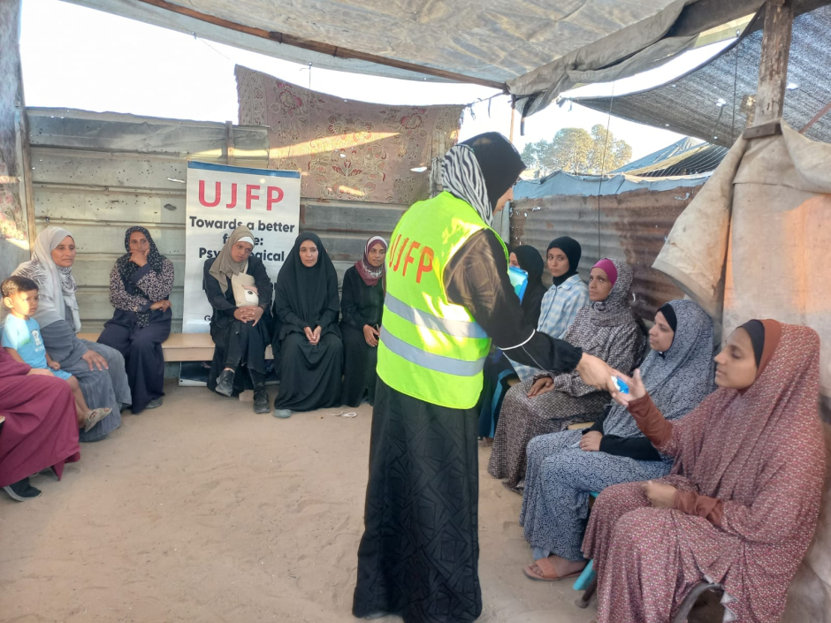 C'est dans ce contexte qu'est intervenue l'équipe de l'UJFP, apportant une lueur d'espoir à travers l'organisation d'un atelier novateur dont le but est d'aider les femmes déplacées à redécouvrir l'importance du soin de soi. La rencontre n'était pas une simple session ponctuelle, mais un espace sûr qui a permis à 20 femmes - mères, travailleuses et jeunes - d'exprimer leurs souffrances et de réfléchir à des solutions simples pour retrouver un certain équilibre dans un quotidien saturé de défis.