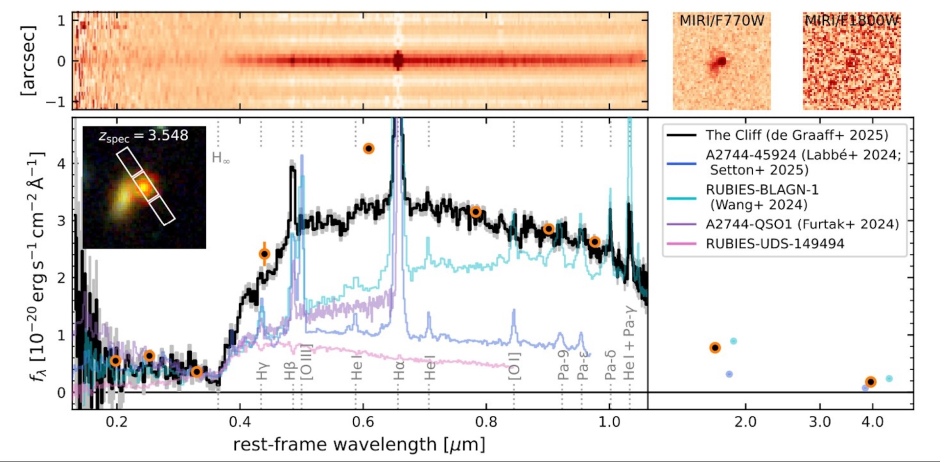 In the light of this object, the researchers noticed a very sharp jump in the brightness called the Balmer break. While this kind of rise is common in the light of different objects, the kind of sharpness seen in this object's light could not be explained by massive galaxies or typical active galactic nuclei, researchers found. They identified it as an exaggerated version of a little red dot and dubbed it "the Cliff" for its sharp rise in the spectrum.