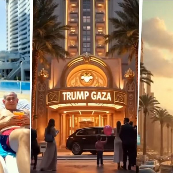 A obra prevista, que se inspira no novo riquismo arquitectónico e violador do ambiente do Dubai e de outras estâncias das petromonarquias árabes, mas ultrapassa até as condições luxuosas por elas proporcionadas, irá assentar num genocídio, numa limpeza étnica, em pilhas de centenas de milhares de restos mortais de seres humanos depositados em cemitérios formais ou improvisados, em valas comuns ou que jazem pulverizados entre milhões de toneladas de escombros.