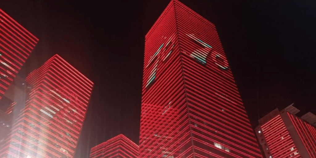 Xinjiang. Urumqi, samedi soir - bâtiments célébrant les 70 ans du développement du Xinjiang
