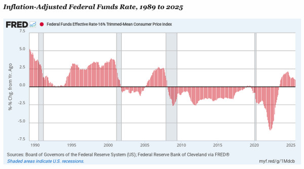 Since the turn of the century, the geniuses on the FOMC have pegged the real Fed Funds Rate at negative levels nearly 80% of the time. And even as of July 2025-three years after allegedly pivoting to inflation-fighting-the real Fed funds rate is only positive by 110 basis points. That's far below real rates of 250 to 500 basis points, which prevailed before Greenspan went all in on money-printing in response to the dot-com bust.