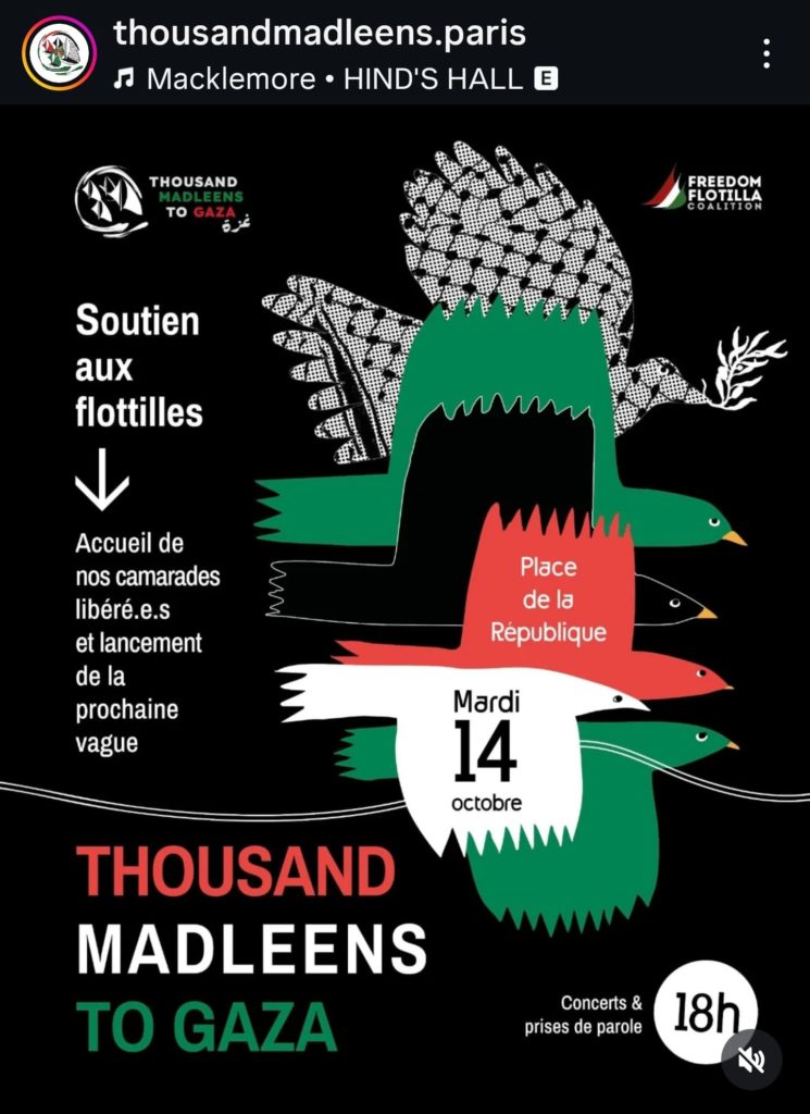 C'est avec Macklemore et Hind's Hall que nous accueillerons à Paris, mardi soir à partir de 18 H, les militants de la Flottille Thousand Madleens.