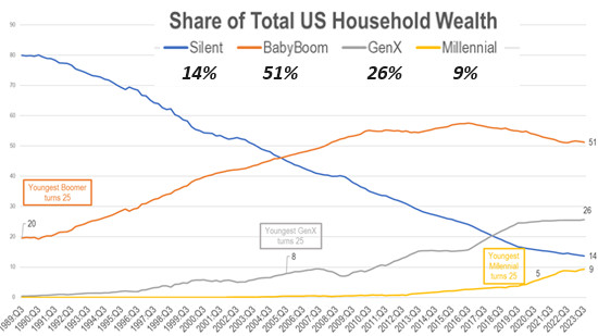 The chart of generational wealth indicates opportunities to build wealth were more accessible pre-2000. Those graduating from high school or university in 2008 or later experienced a much different economy than their parents.