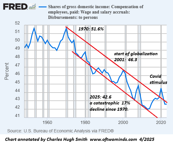 The wealthy own the vast majority of income-generating assets. The majority depend on wages for their living. The decline of wages' share of the economy over the past 50 years is consequential, reflecting the cumulative transfer of $150 trillion from wage earners to capital over the past five decades.