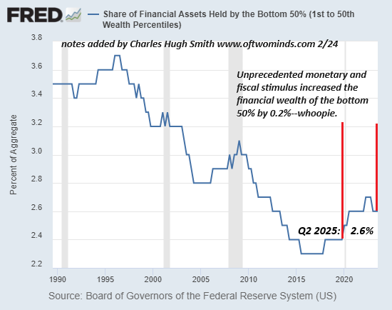 The bottom 50% of American households own a tiny slice of the nation's financial wealth. The vast expansion of central bank stimulus and the resulting asset bubbles haven't increased the wealth of the bottom 170 million Americans, which hovers at 2.6%--signal noise compared to the 31% owned by the top 1% and the 68% owned by the top 10%.
