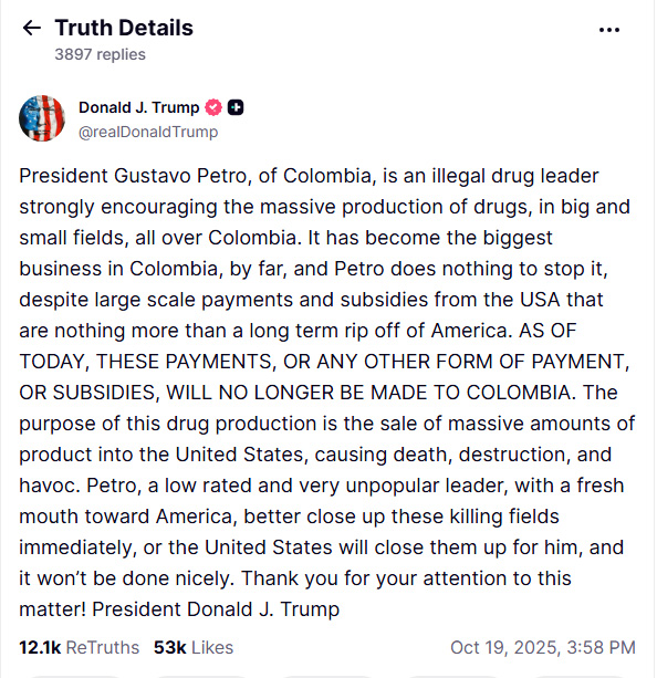 Un message de Trump diffusé sur sa chaîne Truth Social, le dimanche 19 octobre accuse le président colombien Gustavo Petro d'être un baron de la drogue et menace d'envoyer des troupes éradiquer les cultures de feuilles de coca, à l'origine de la production de cocaïne.