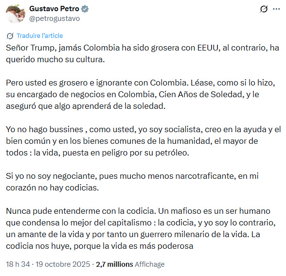 La Réponse de [twsrc%5Etfw%7Ctwcamp%5Etweetembed%7Ctwterm%5E1979949367881556106%7Ctwgr%5Eab691afb27af91f1c501d106791e0cd4c85afaad%7Ctwcon%5Es1_&ref_url=https%3A%2F%2Fwww.aa.com.tr%2Fes%2Fmundo%2Fpetro-acusa-a-trump-de-ser-grosero-e-ignorante-con-colombia-%2F3721607"] Gustavo Petro à Donald Trump