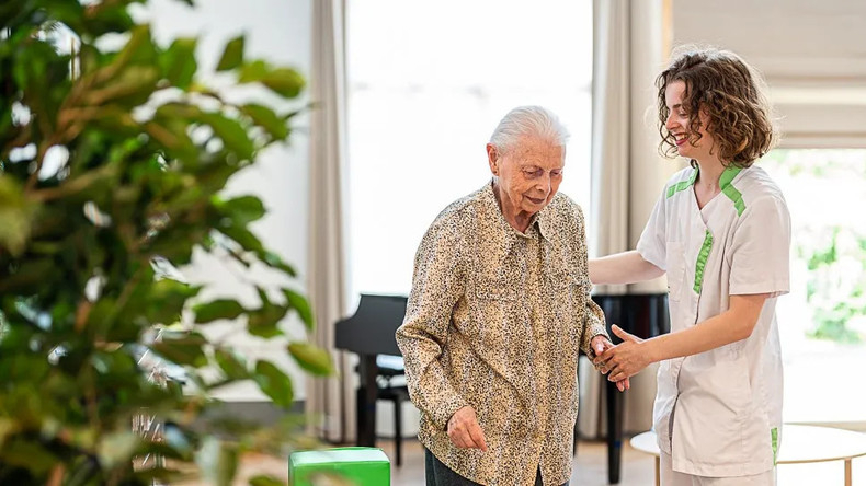 Une personne âgée aidée dans un Ehpad