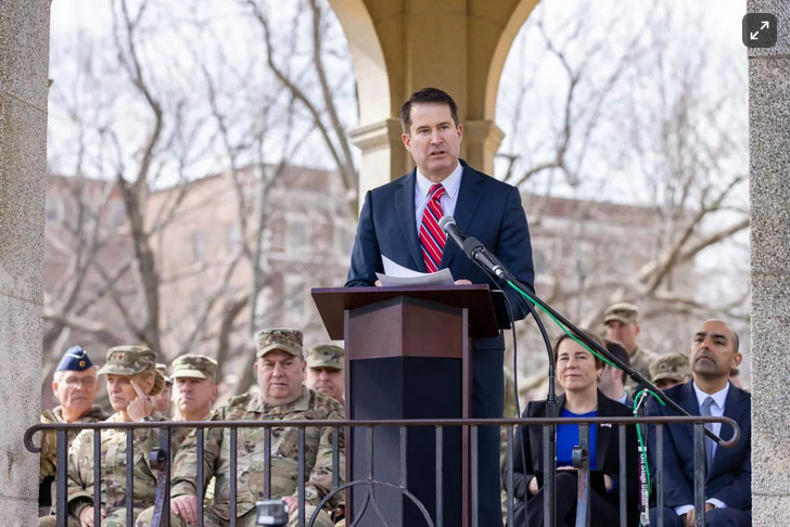 Le député Seth Moulton lors d'un évènement organisé à l'occasion du Patriot Day dans le Massachusetts, le 13 avril 2024. Photo © Joshua Qualls/Bureau de presse du gouverneur.