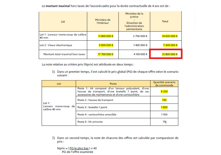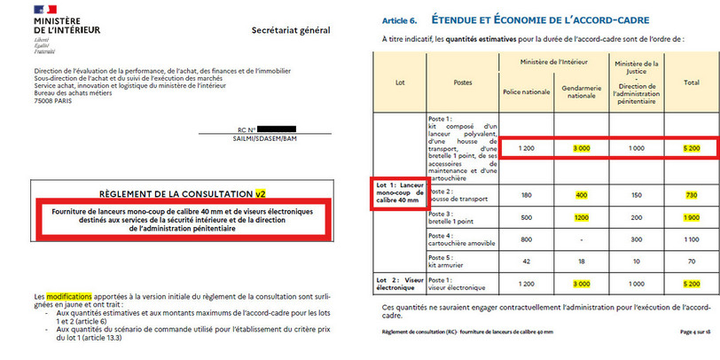 Selon le document, la Gendarmerie nationale et la Police achèteraient respectivement 3 000 et 1 200 lance-grenades avec des munitions non explosives. Un millier d'armes supplémentaires serait acquis par l'administration pénitentiaire française. Au total, ce sont 5 200 armes et autant de viseurs qui seront achetés. Par ailleurs, les autorités acquerraient 730 housses pour les lance-grenades, près de 2 000 sangles pour les transporter, ainsi que 1 100 cartouchières amovibles.