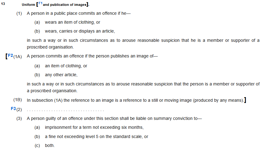 Here is the relevant part of Section 13 of the Terrorism Act.