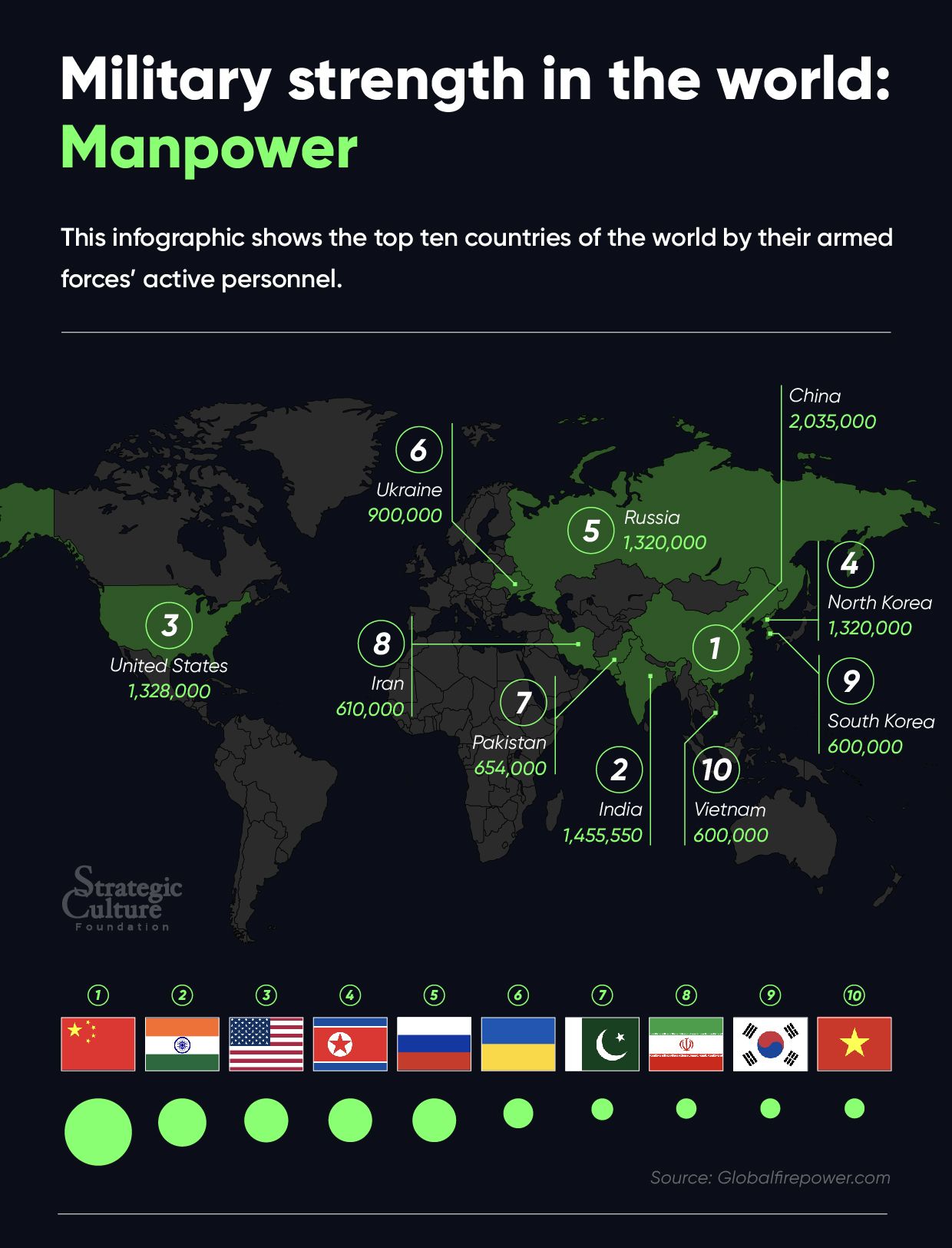 This infographic shows the top ten countries of the world by their armed forces' active personnel