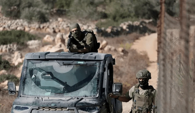 Des soldats israéliens montent la garde près d'une porte close pendant la récolte des olives
