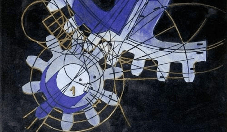 Francis Picabia, «Machine Tournez Vite» (1916-1918). Encre, aquarelle et or nacré sur une lithographie du XIXe siècle.