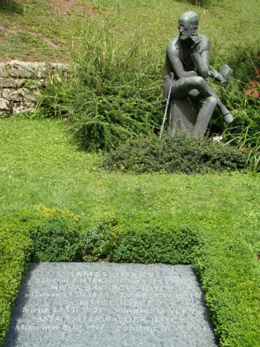 James Joyce est retourné à Zurich en 1940 et y a trouvé, l'année suivante, son dernier repos. En mars de cette année, j'ai finalement décidé de visiter la tombe de Joyce, un Ehrengrab, située au fond du couloir central du cimetière de Fluntern, où sont aussi enterrés sa femme Nora, son fils Giorgio et sa femme Asta. Il ne manque que sa fille, Lucia Joyce, qui a été diagnostiquée schizophrène et a été une patiente de C. G. Jung, et qui a été internée au Burghölzi, mais a été transférée dans un hôpital à Northampton, la ville où elle est décédée et où elle repose. L'endroit est discret et parfaitement entretenu, et la statue de Joyce, œuvre de Milton Hebald, nous regarde détendue, tandis qu'il fait une pause de lecture et de cigarette…