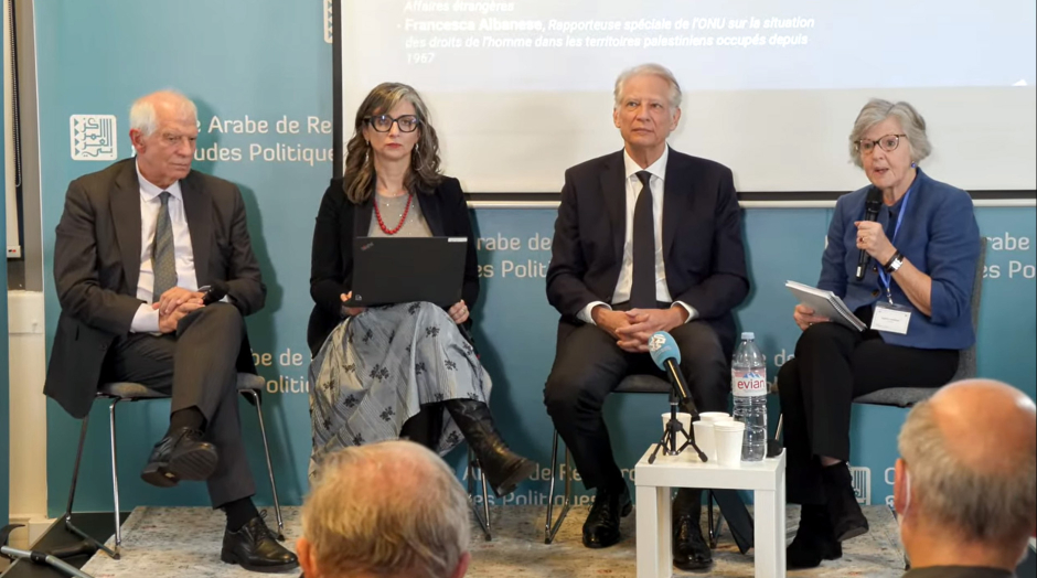 Débat de clôture : Josep Borrell, Président du CIDOB et ancien Haut Représentant de l'Union européenne pour les affaires étrangères et la politique de sécurité ainsi qu'ancien vice-président de la Commission européenne. Francesca Albanese, Rapporteuse spéciale de I'ONU sur la situation des droits de l'homme dans les territoires palestiniens occupés depuis 1967. Dominique de Villepin, Ancien Premier ministre et ministre des Affaires étrangères.. Débat modéré par Agnès Levallois, iReMMO (Capture d'écran)