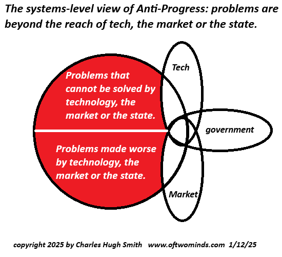 The theme here is problems are not resolved, they're papered over with profitable faux fixes. In my previous post, I described how the problem of our collective health crisis isn't being resolved, it's being milked for profit by faux "solutions" that don't actually resolve the problem, they keep it on simmer because this is the most profitable arrangement for those providing the illusory "solution."