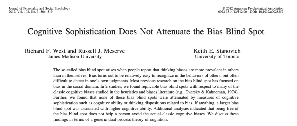 Une étude importante intitulée «La sophistication cognitive n'atténue pas l'angle mort des biais» a conclu que les personnes très intelligentes sont plus sujettes au biais de confirmation. Elles sont douées pour défendre leurs croyances, mais moins pour discerner la vérité.