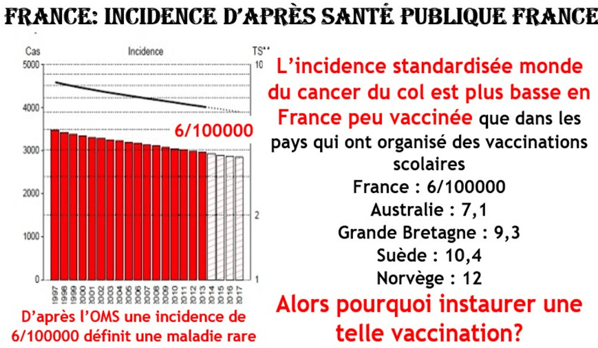 Dans notre pays peu vacciné, le cancer du col est devenu une maladie rare contrairement aux pays très vaccinés que nos dirigeants citent en exemple ! Et si on accepte la nouvelle définition d'éradication que l'OMS prône nous l'aurions même éradiqué !