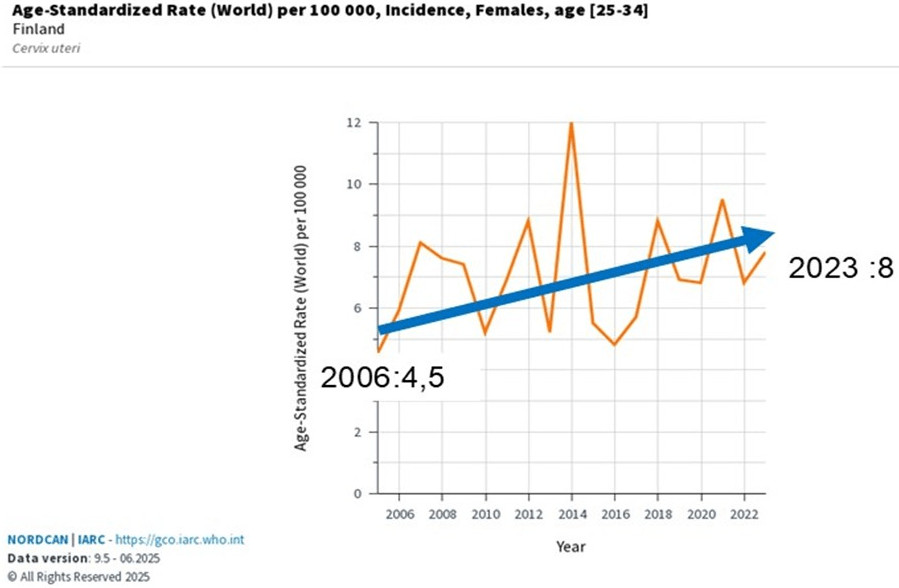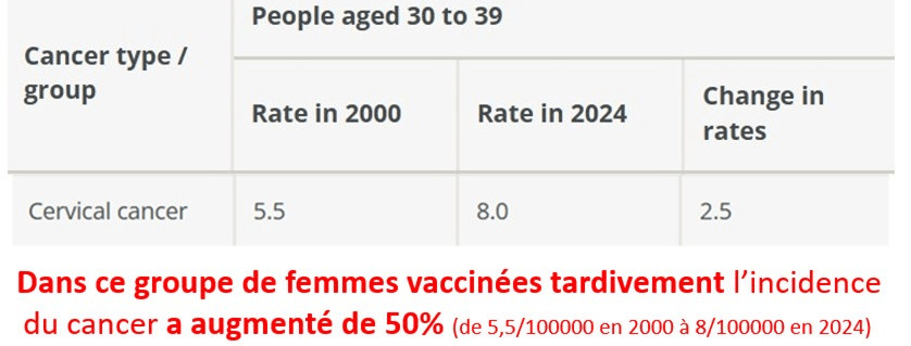 Dans le groupe le plus vacciné arrivé à l'âge du cancer (les 25-34 ans), l'incidence du cancer du col a augmenté de plus de 70%. (de 4,5 à 8)