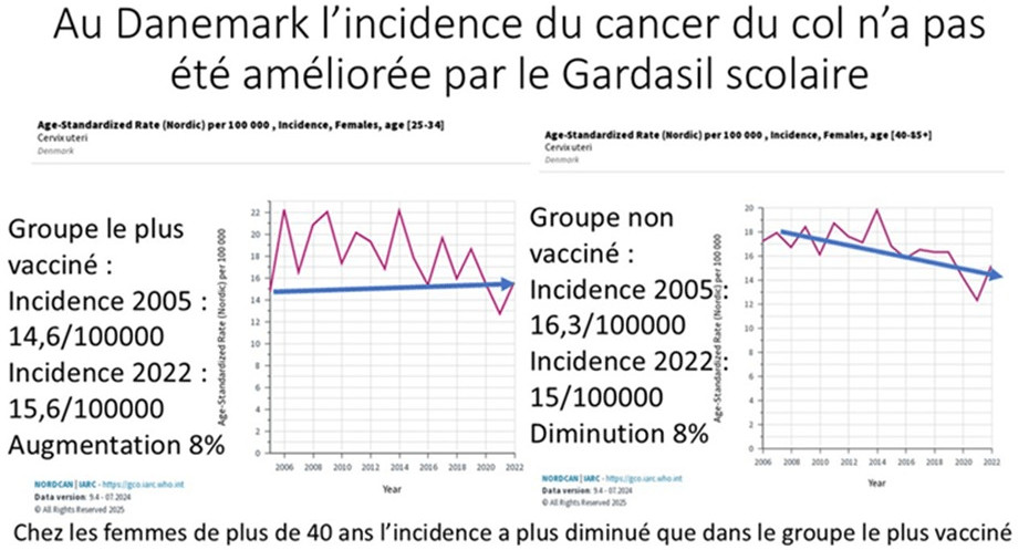 En 2024 l'agence nationale australienne a estimé le nombre de nouveaux cancers du col à 1030 (soit une augmentation de près de 33% du chiffre d'avant la vaccination) et son incidence à 7,1/100000 (22) (soit 15% de plus qu'en France peu vaccinée). Comment peut-on croire à l'éradication prochaine du cancer que promettent constamment les avocats du Gardasil dans tous les médias ? (23)