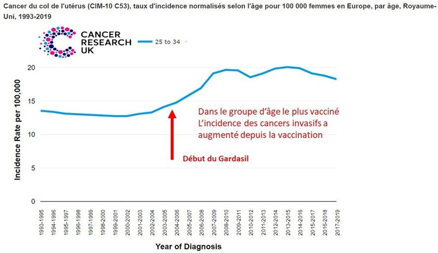 La Grande-Bretagne a instauré la vaccination scolaire au Gardasil pour les filles dès 2007. 18 ans plus tard l'incidence du cancer du col a augmenté dans le groupe témoin des vaccinées (25-34 ans) alors qu'il continue à baisser chez les femmes de plus de 40 ans (non vaccinées).