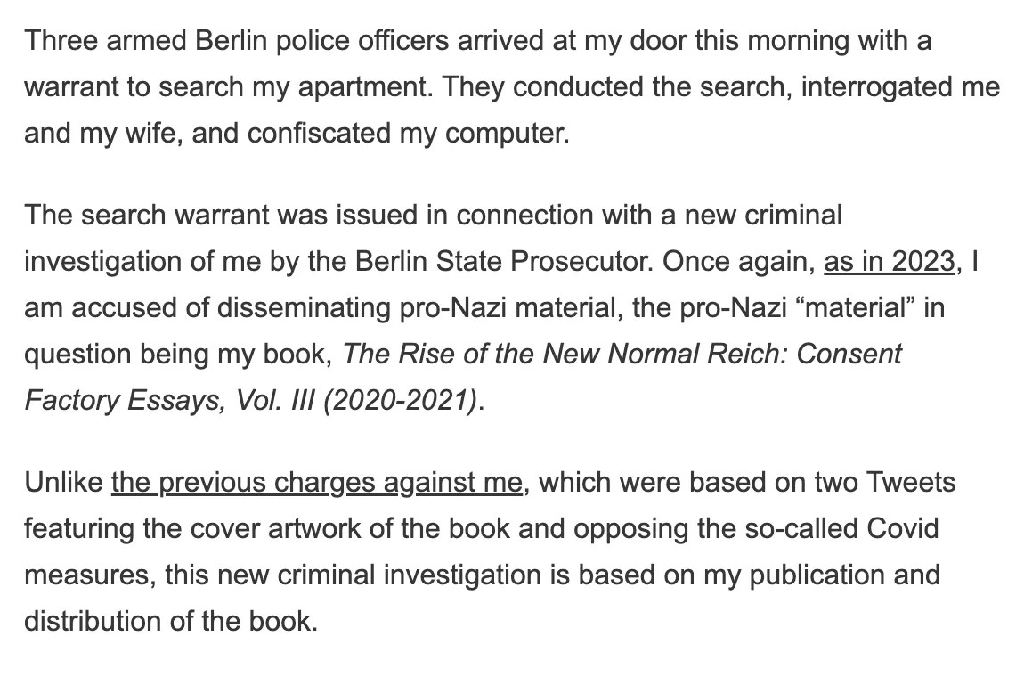 What is happening to our American friend in Berlin is bad but it's also pretty middle-of-the-road as far as German speech harassment goes. Lots of Germans have been punished much more heavily for doing much less, and I've carefully catalogued almost every single case that has made it into the press over the years. 1 As far as I know, I'm the only person doing this in English at all. Most speech police victims don't get any write-ups in the Atlantic. Matt Taibbi doesn't give them interviews and Die Zeit could care less about them.