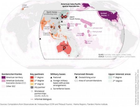 L'Indo-Pacifique représente ainsi la manifestation la plus aboutie d'une reconfiguration de l'ordre international fondée sur les sphères d'influence. Cette région réunit tous les éléments qui définissent cette logique : rivalité hégémonique entre superpuissances, équilibre des pouvoirs entre acteurs principaux et secondaires, formation d'alliances défensives et offensives, espaces de confrontation directe (dans le domaine commercial ou militaire) et indirecte (comme dans le cas de Taïwan), et même acteurs perturbateurs capables de déstabiliser la région, à l'instar de la Corée du Nord.