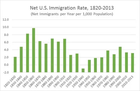 The three figures above are dispositive. They show that America's robust population growth over the last 150 years has been heavily dependent upon new waves of immigrants decade after decade. The graph below shows that this heavy immigrant inflow-driven by the magnet of economic opportunity-has been continuous, and broke below the zero line only during the economic collapse of the Great Depression.