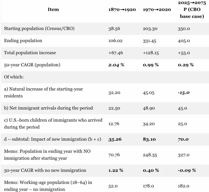 Decomposition of U.S. Population Change: 1870→1920 vs. 1970→2020 vs. 2025→2075 (50-year periods in millions)