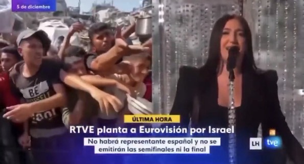 Suite à la décision de l'Eurovision d'autoriser la participation d'Israël, la chaîne de télévision publique espagnole RTVE s'est non seulement retirée du concours. Elle diffuse sur le même écran la prestation de la chanteuse représentant Israël, et des images de bombardements et d'enfants affamés à Gaza, pour bien montrer l'obscénité d'une telle décision..