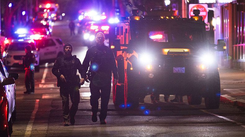 Des policiers sur les lieux d'une fusillade qui a fait deux morts à l'Université Brown le 13 décembre 2025, à Providence, aux États-Unis.