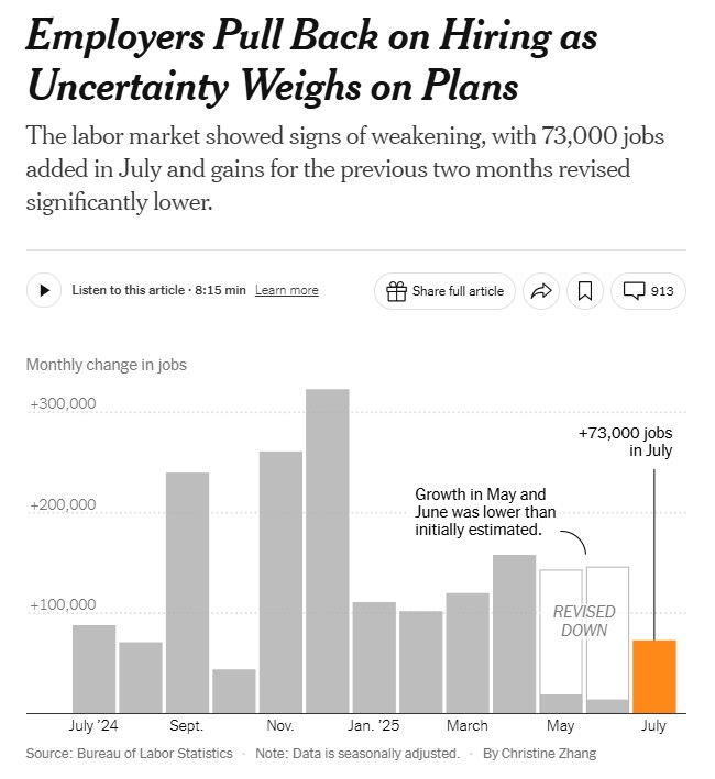 Then on August 1st the other shoe finally dropped, as the estimated new job numbers for July proved far below expectations while the revised data for May and June revealed that job creation had hit a wall soon after Trump's tariff announcement, reduced to almost nothing. The chart shown in the New York Times was quite telling, certainly justifying the headline:
